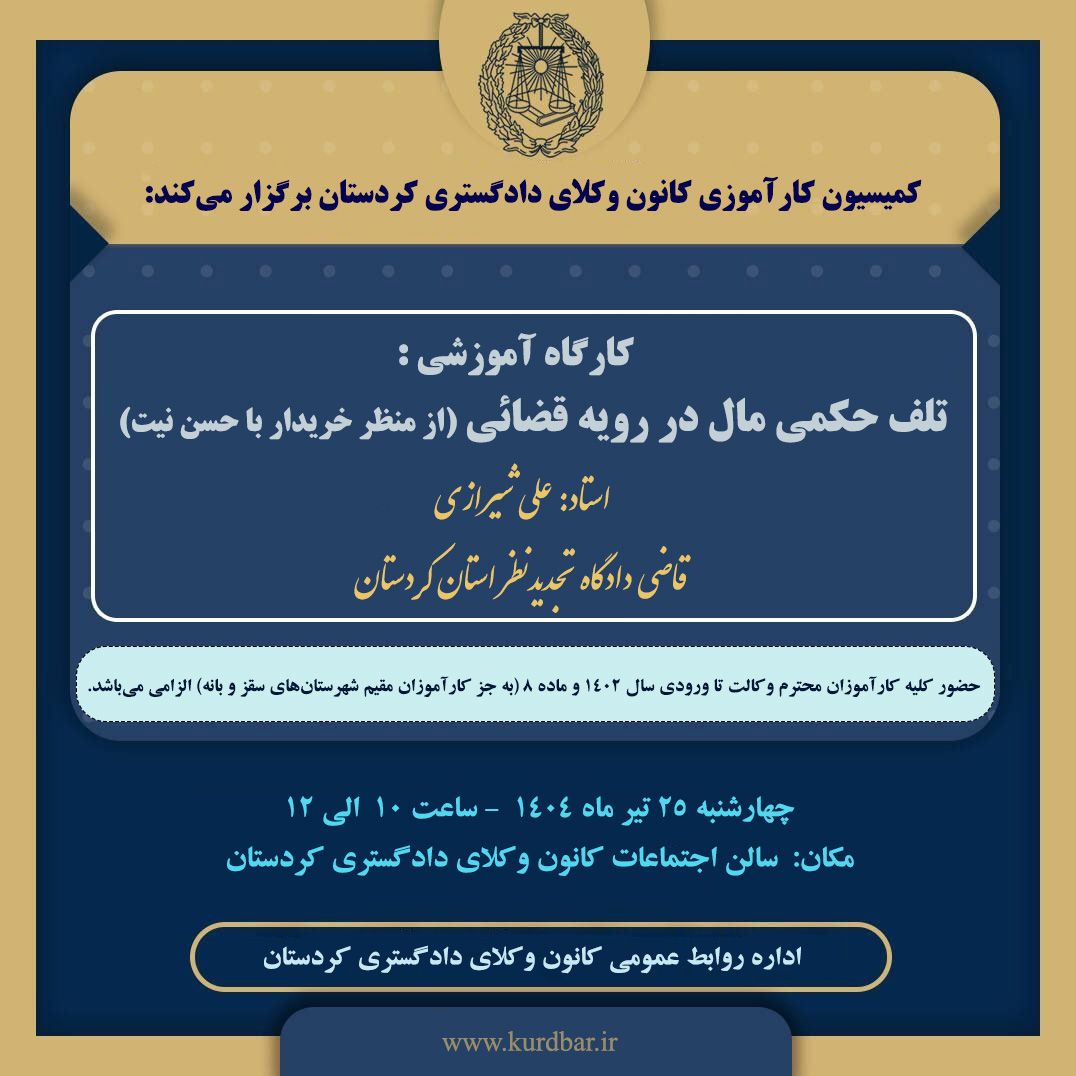 کمیسیون کارآموزی کانون وکلای دادگستری کردستان برگزار میکند: کارگاه آموزشی مورخ 1404/04/25