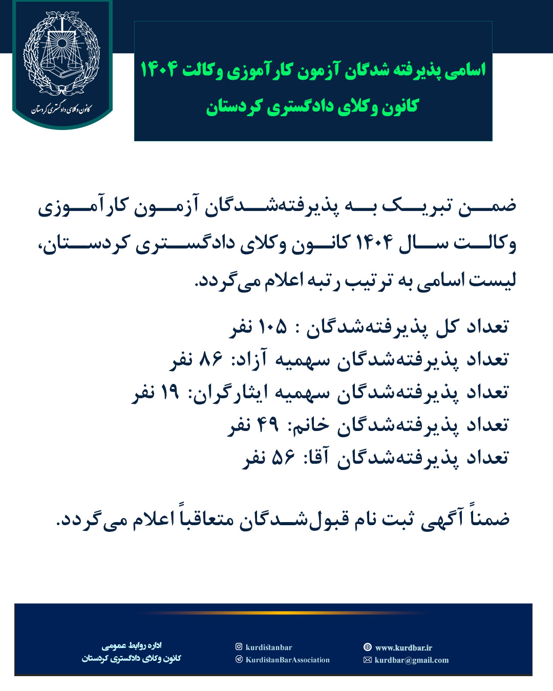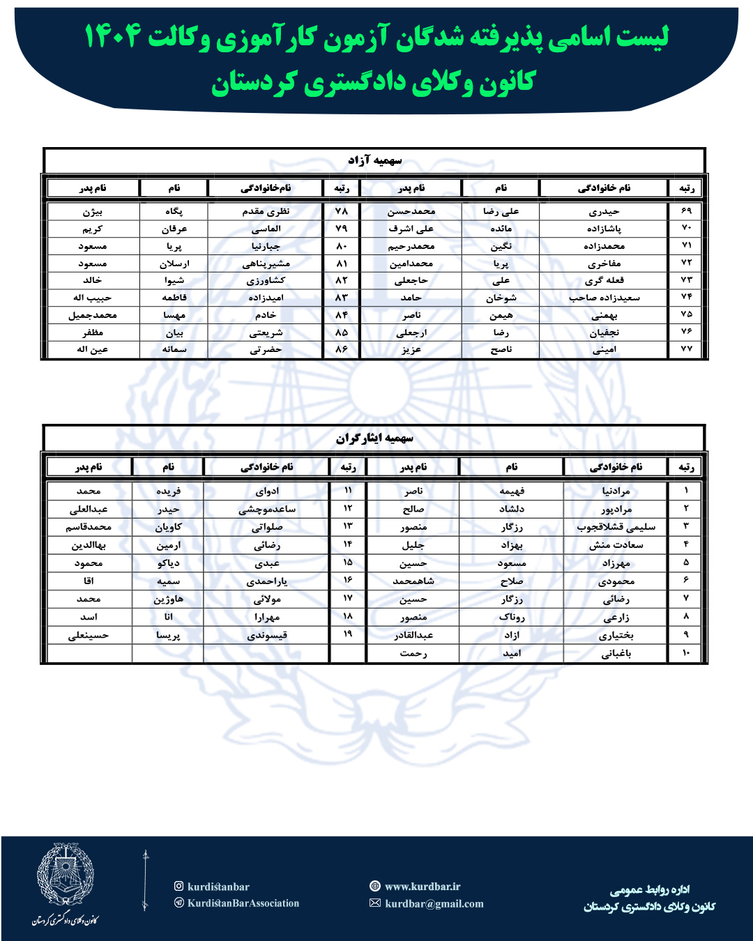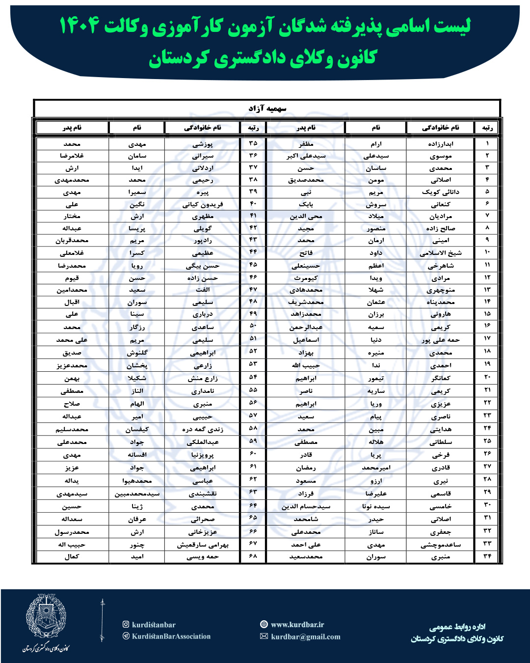 لیست اسامی پذیرفته شدگان آزمون کارآموزی وکالت 1404 کانون وکلای دادگستری کردستان